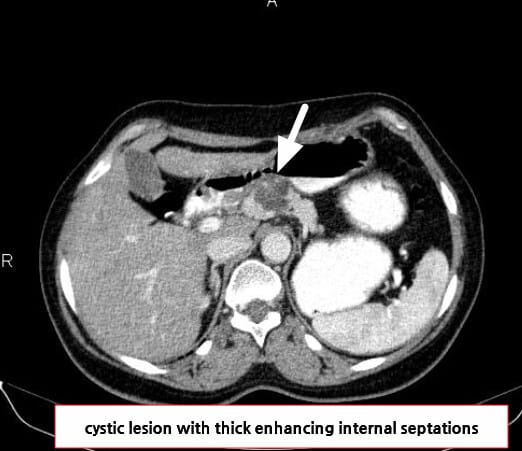 대부분 무증상이며, 췌장 전반 어디서나 발생할 수 있지만 특히 췌두부에서 잘 발견됩니다. 낭종 내 중심성 흉(central scar)이 특징입니다.