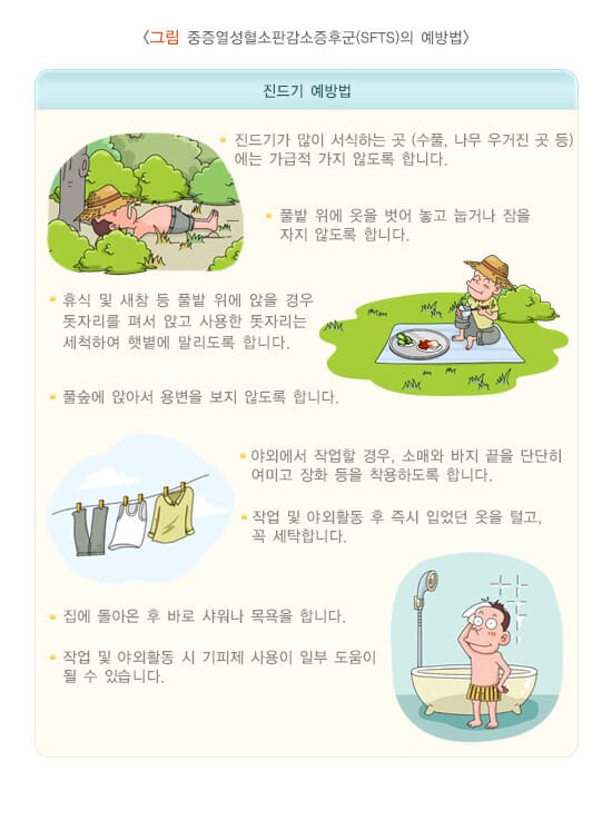 이 저작물은 질병관리청 국가건강정보포털의 “중증열성혈소판감소증후군(SFTS)“에서 발췌하였으며, 해당 저작물은 국가건강정보포털 누리집(health.kdca.go.kr)에서 무료로 사용하실 수 있습니다.