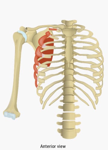 Claudia Krebs , adapted by Monika Fejtek , supported by HIVE, The University of British Columbia , available at Clinical Anatomy Website , licensed under CC BY-NC-SA 4.0 .전거근 (Serratus Anterior) 전거근 (Serratus Anterior) ✅ 제1~8늑골 외측면에서 시작하여 견갑골 내측면 전방에 부착됩니다. 🔴 견갑골을 전인시키고 상방회전시켜 팔을 머리 위로 올릴 수 있게 하며, 장흉신경 손상 시 날개 어깨(winged scapula)가 발생합니다.