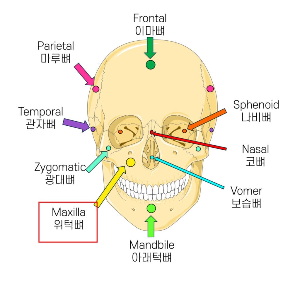 | ✅ 상악을 이루며, 치아, 비강 측벽, 눈확의 바닥 등 다양한 구조와 연계되는 복합 뼈입니다. |