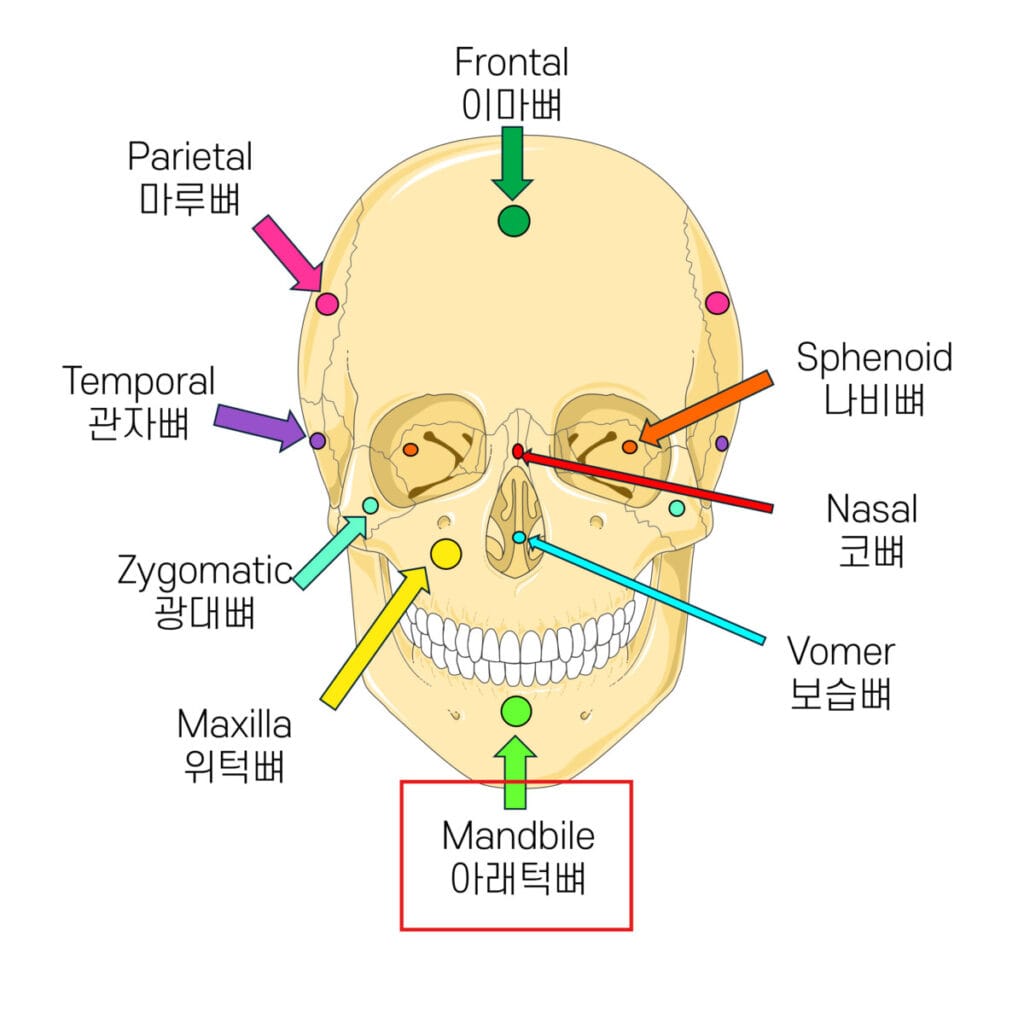 | ✅ 두개골 중 유일하게 움직이는 뼈로, 하악과 치아를 포함하며, 턱관절과 연결됩니다. |