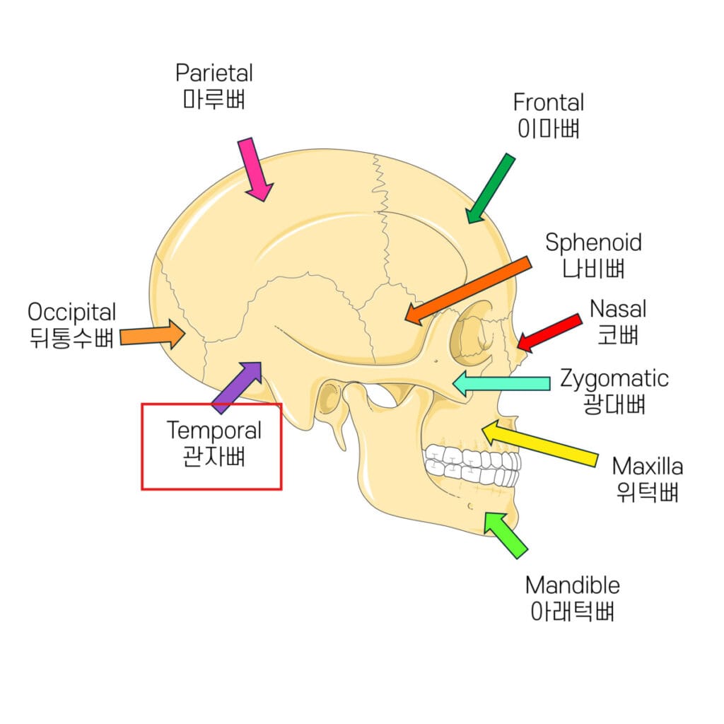 | ✅ 귀 주위에 위치한 뼈로, 외이도와 측두하악관절(TMJ), 속귀 구조를 포함합니다. |