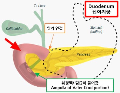 | ✅ 췌장액과 담즙은 각각 췌관(Pancreatic duct) / 총담관(Common bile duct)을 통해 흘러옵니다. ✅ 췌관과 담관은 십이지장의 2nd portion에서 합쳐져 바터 팽대부(Ampulla of Vater)’를 형성합니다. |