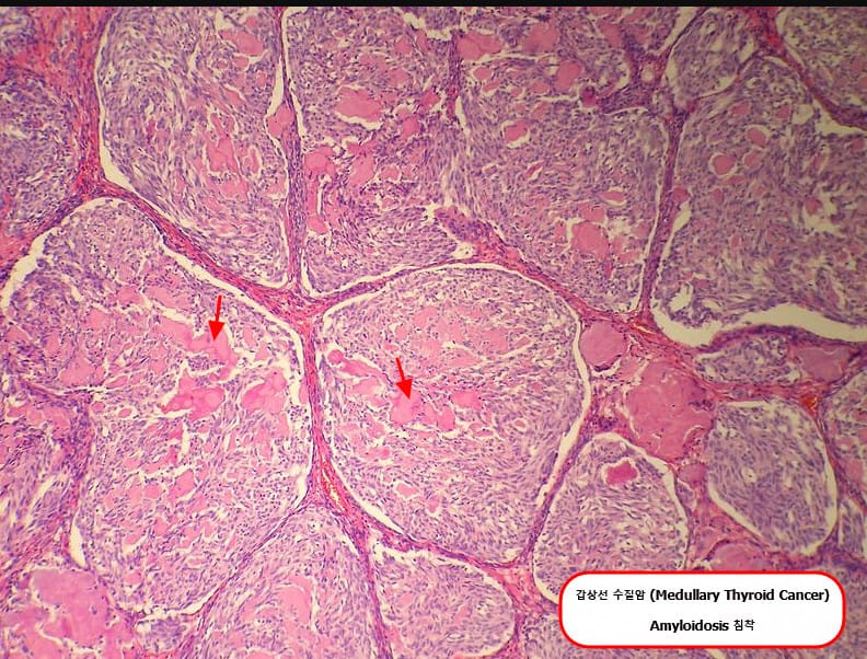 수질암은 갑상선의 C세포(부여포세포)에서 발생하는 드문 아형으로, 전체 갑상선암의 약 5%를 차지합니다. 칼시토닌(Calcitonin)을 분비하는 기능성 종양이며, 아밀로이드 침착이 관찰됩니다. 가족성(MEN 2형)과 산발성 형태로 나뉘며, 방사성 아이오딘 치료에는 반응하지 않아 주로 수술을 진행합니다.