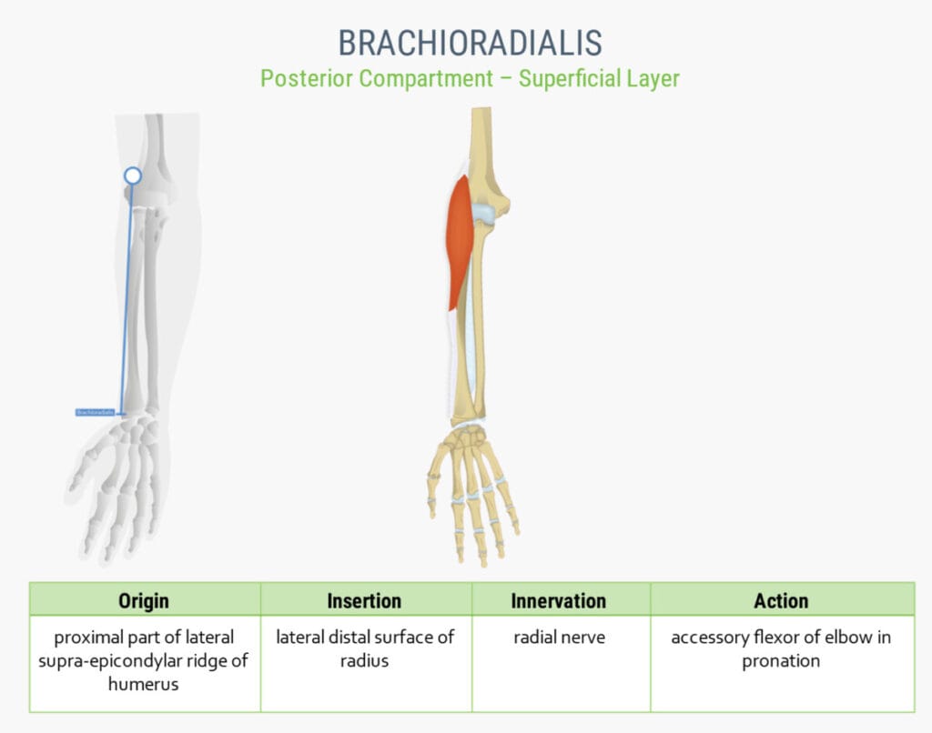 | ✅ 상완골 외측 상과능(lateral supracondylar ridge)에서 기시하여 요골 경상돌기(radial styloid process) 부근에 부착하며, 팔꿈치 굴곡에 관여합니다. 특히 전완이 중간 자세일 때 강하게 작용합니다. |