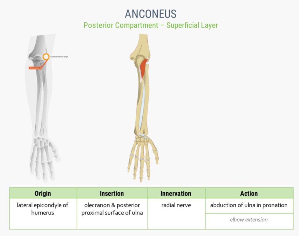 | ✅ 상완골 외측 상과(lateral epicondyle)에서 기시하여 척골의 olecranon과 후면에 부착하며, 팔꿈치 신전을 보조하고 관절 안정성을 유지합니다. |