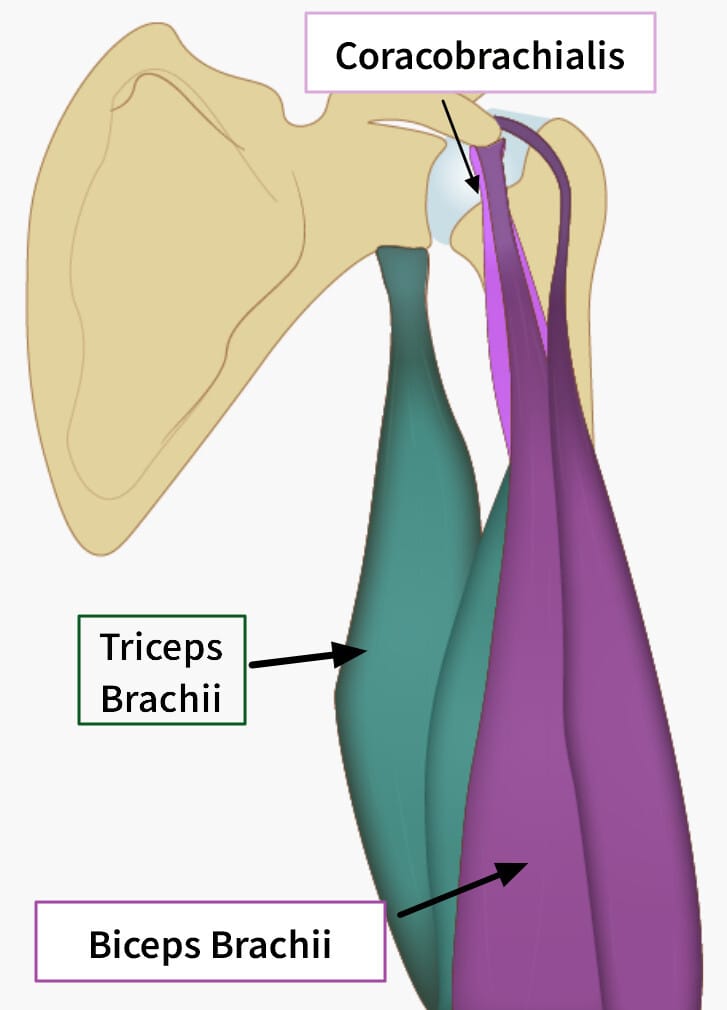 - 부리위팔근(Coracobrachialis) – 어깨 관절에서 팔을 앞으로 들고 안쪽으로 모음.